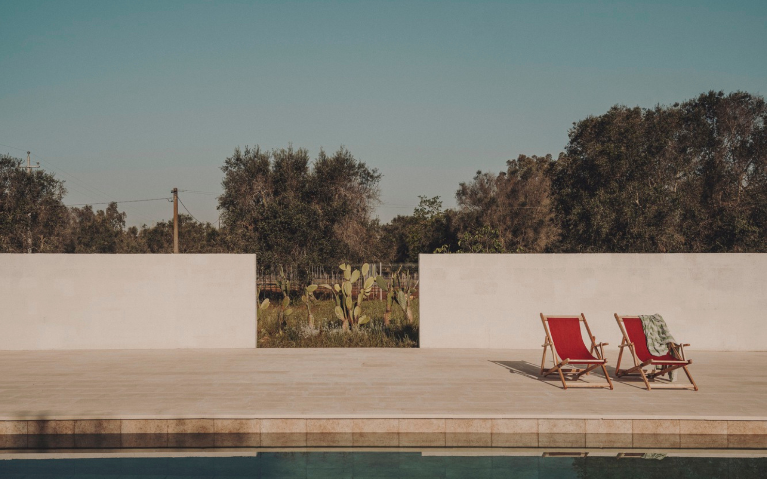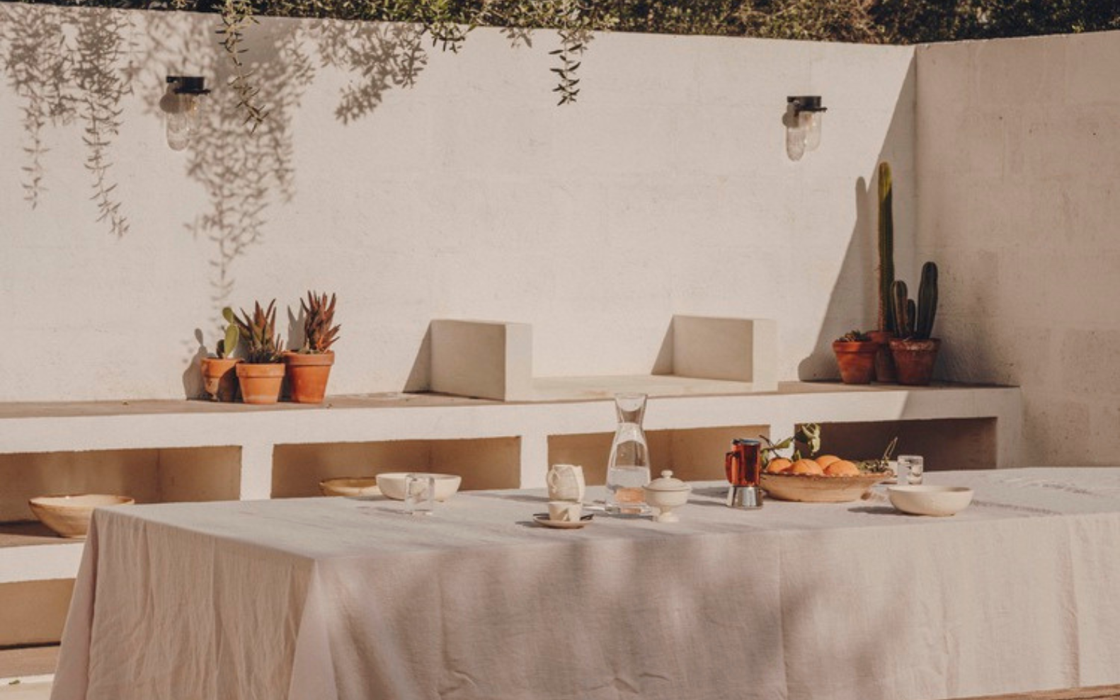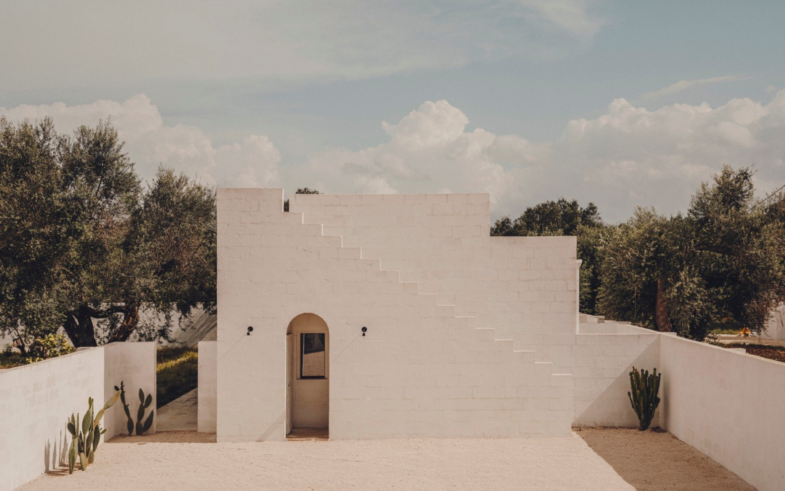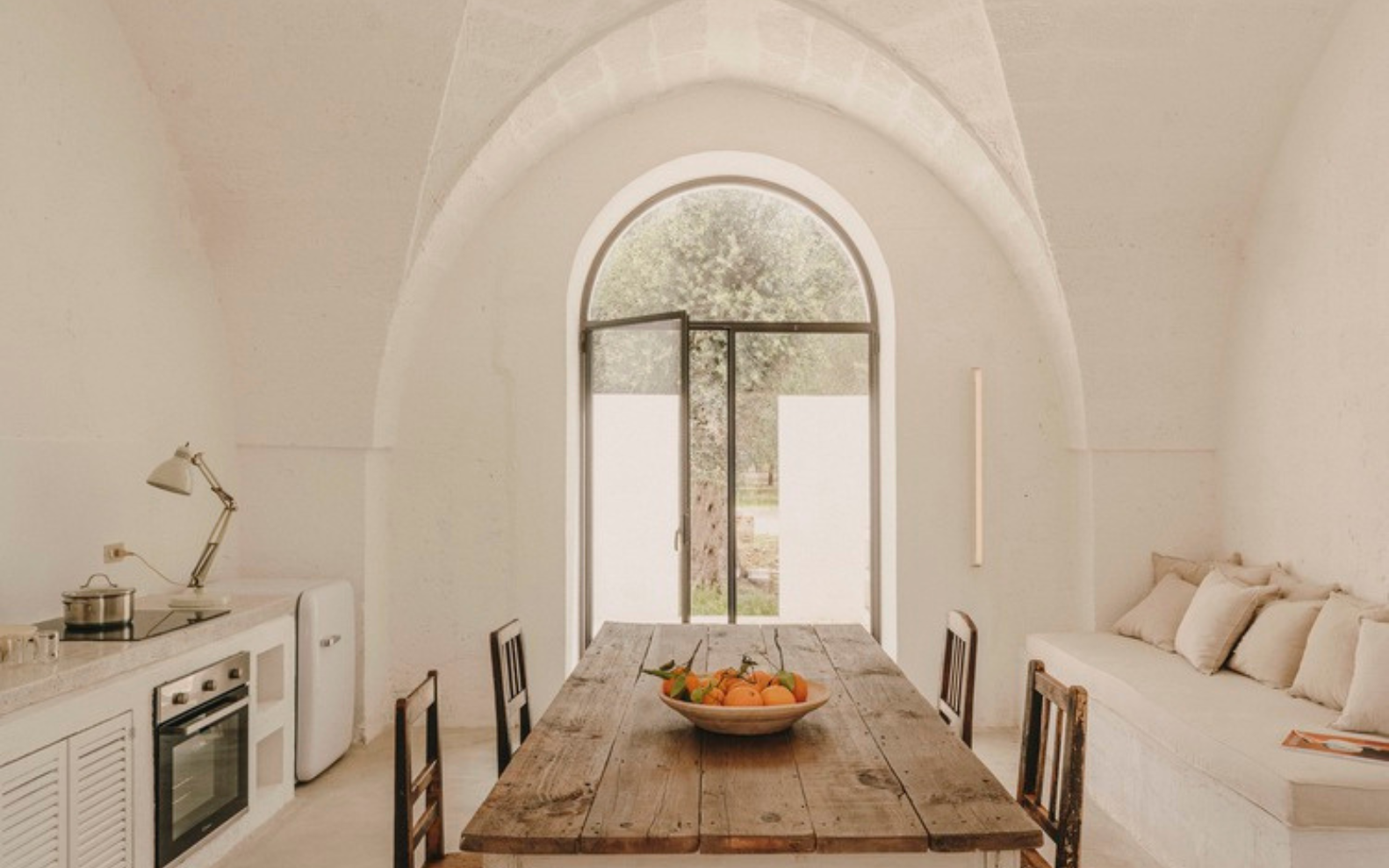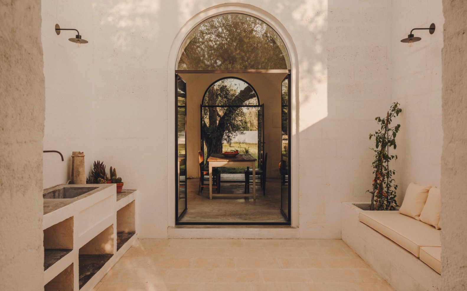 The interiors are furnished with vintage tables, chairs, ceramics, and lamps, as well as pieces from brands like Frama, Lumina, Bongio, Tine K, Gervasoni, and local tableware Nicola Fasano.