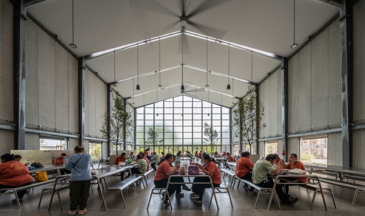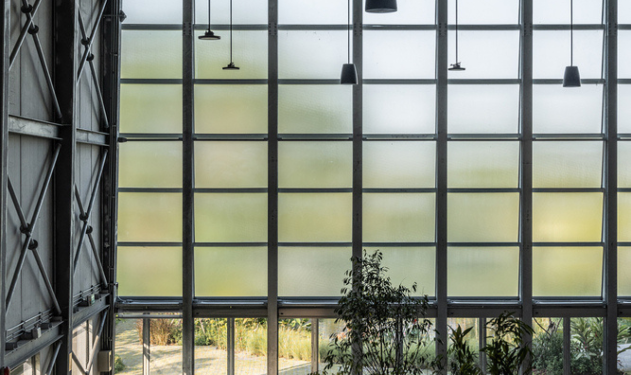 The placement of Building A is designed to consider the natural environment, with walking routes around the reservoir creating garden space for the cafeteria. Textured glass shutters on the northeast side allow maximum natural light and air change dynamics, reducing electricity usage. Steel wire nets protect the interior from birds while still letting in a constant breeze and providing good visibility. Service areas are strategically placed towards the southwestern edge of the property, acting as a shield from the afternoon heat.