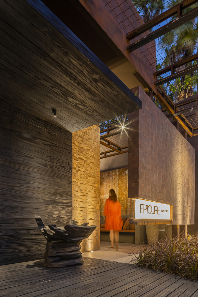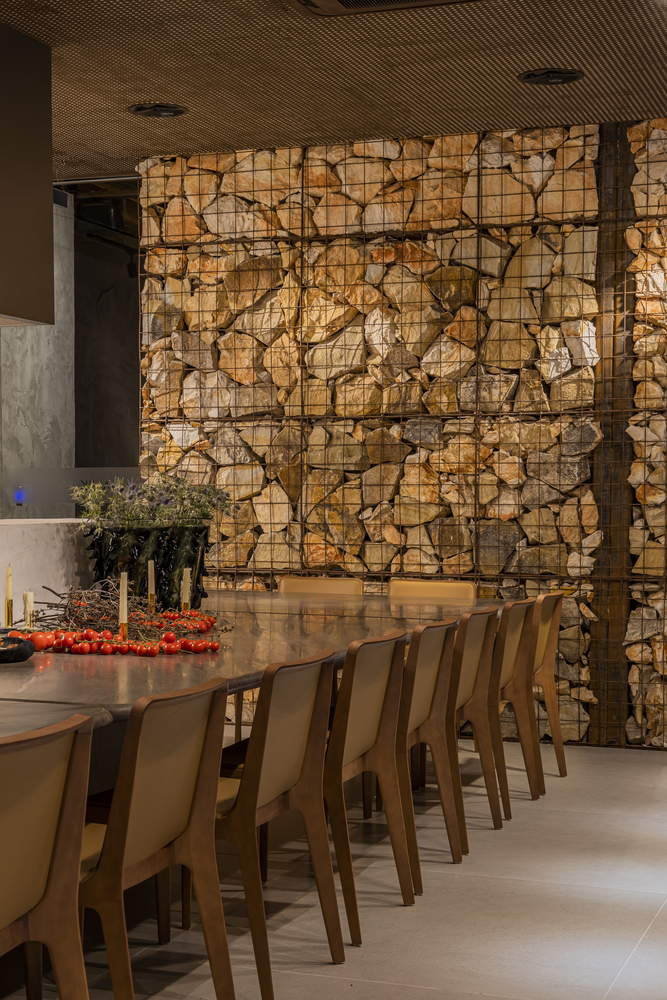 The project sought to reflect and conceptualize the space with warm, terracotta tones, approaching all the materiality of wood and brick, bringing a very sensorial experience through the space that was built from scratch.The highlights of the project are the large table with 16 seats in Elegant Brown quartzite and suspended by a metallic structure set in a concrete wall; the metallic gabion wall filled with pieces of raw Perla Santana quartzite and the Arezzo quartzite sheets through which the water that falls into the water mirror created in the external area drains, contributing to the rustic atmosphere and generating a unique experience for those who have passed through shows and had the opportunity to check out the space.