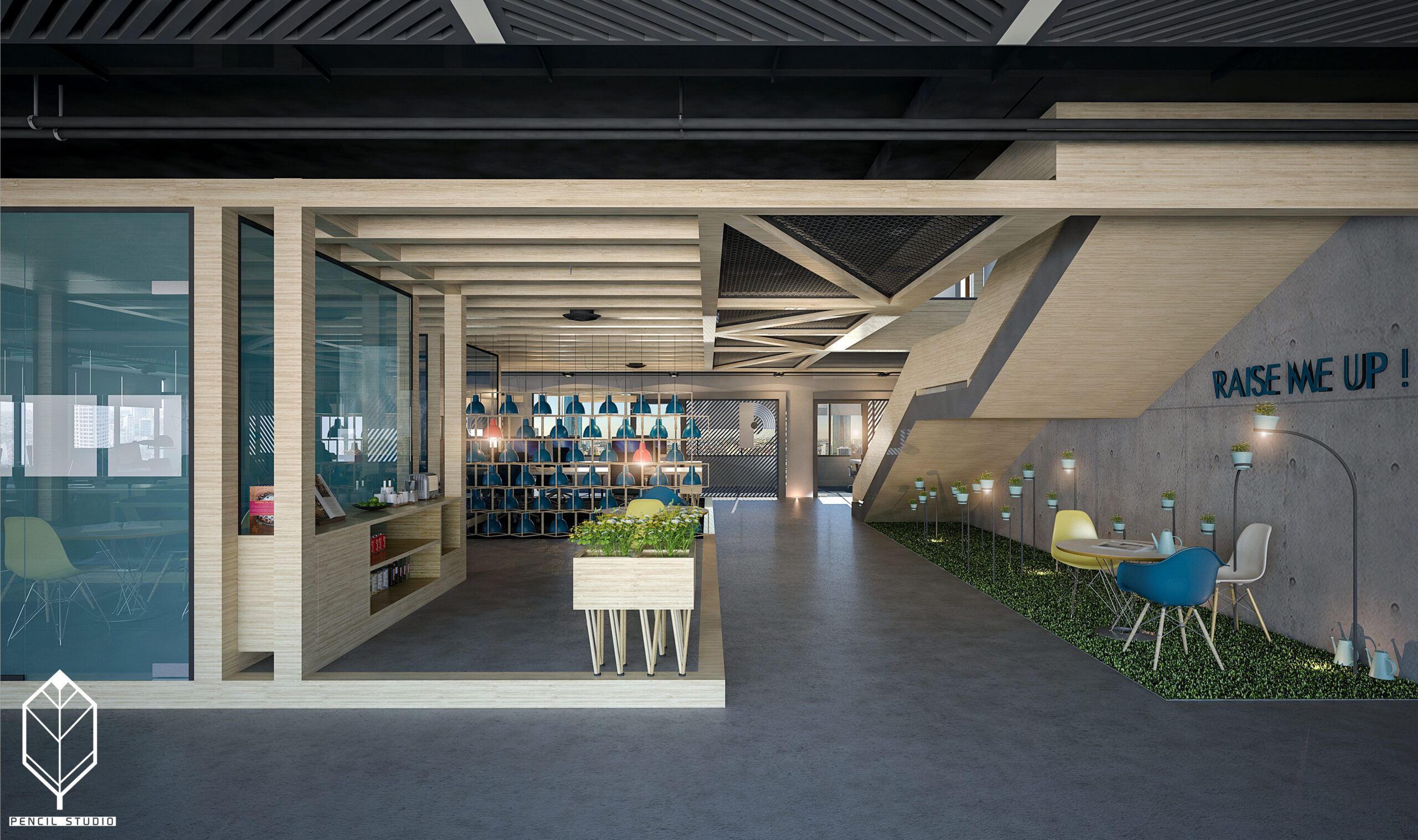 Một phần quan trọng trong thiết kế không gian văn phòng đẹp là không gian xanh, với những chậu cây cảnh được sắp xếp tinh tế. Điều này không chỉ giúp xoa dịu bầu không khí mà còn tạo ra một không gian làm việc gần gũi với thiên nhiên.