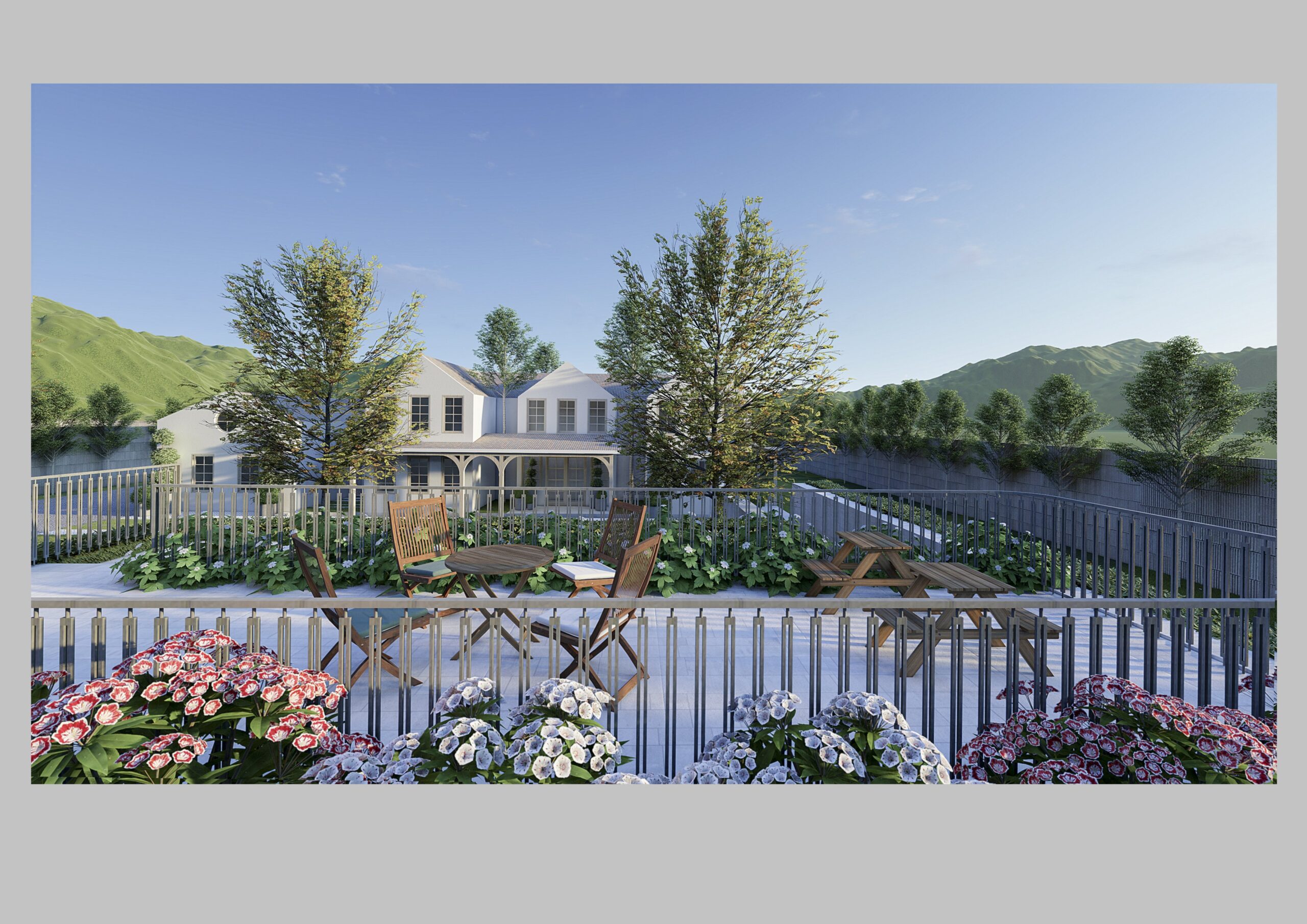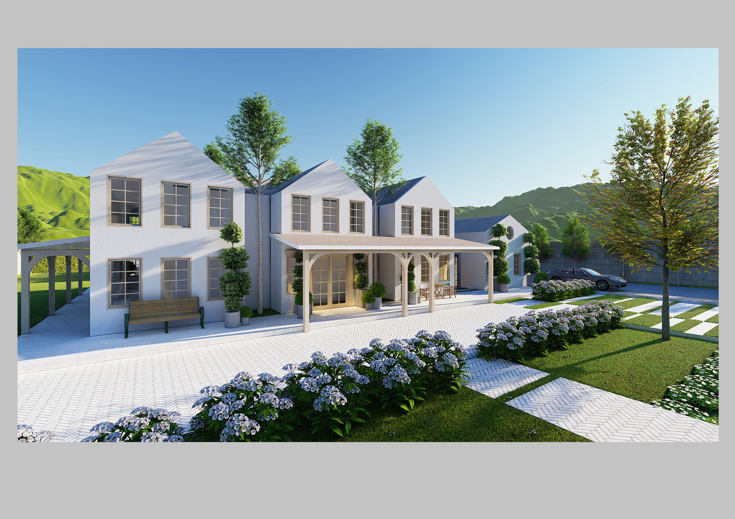 Để ngôi nhà hòa hợp tuyệt đối với môi trường tự nhiên, chúng tôi đã cân nhắc kỹ lưỡng vị trí xây dựng, tận dụng tầm nhìn bao quát ra những ngọn đồi uốn lượn và mặt nước gần đó. Thiết kế nổi bật với các khung cửa sổ lớn để tối đa hóa ánh sáng tự nhiên và thu trọn khung cảnh bên ngoài. Sơ đồ mặt bằng mở giúp tăng cường trải nghiệm sống kết nối giữa trong nhà và ngoài trời, tối ưu hóa không gian và tạo ra bầu không khí gần gủi.