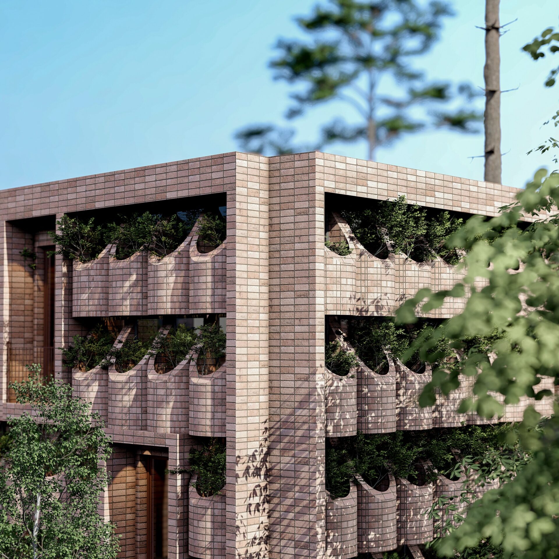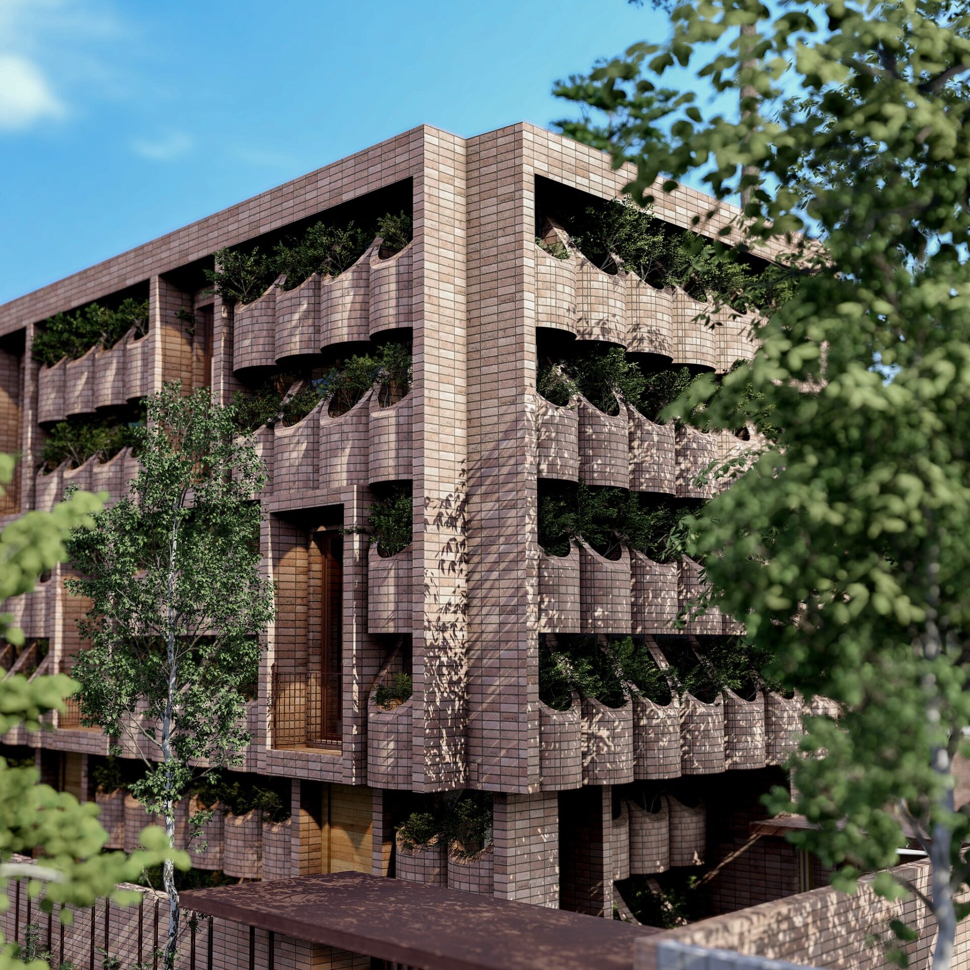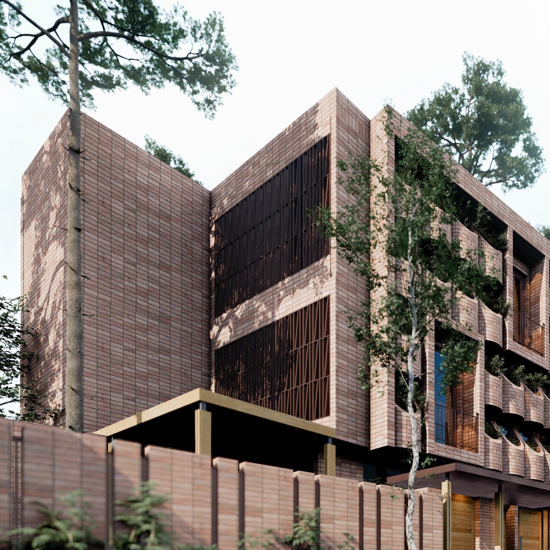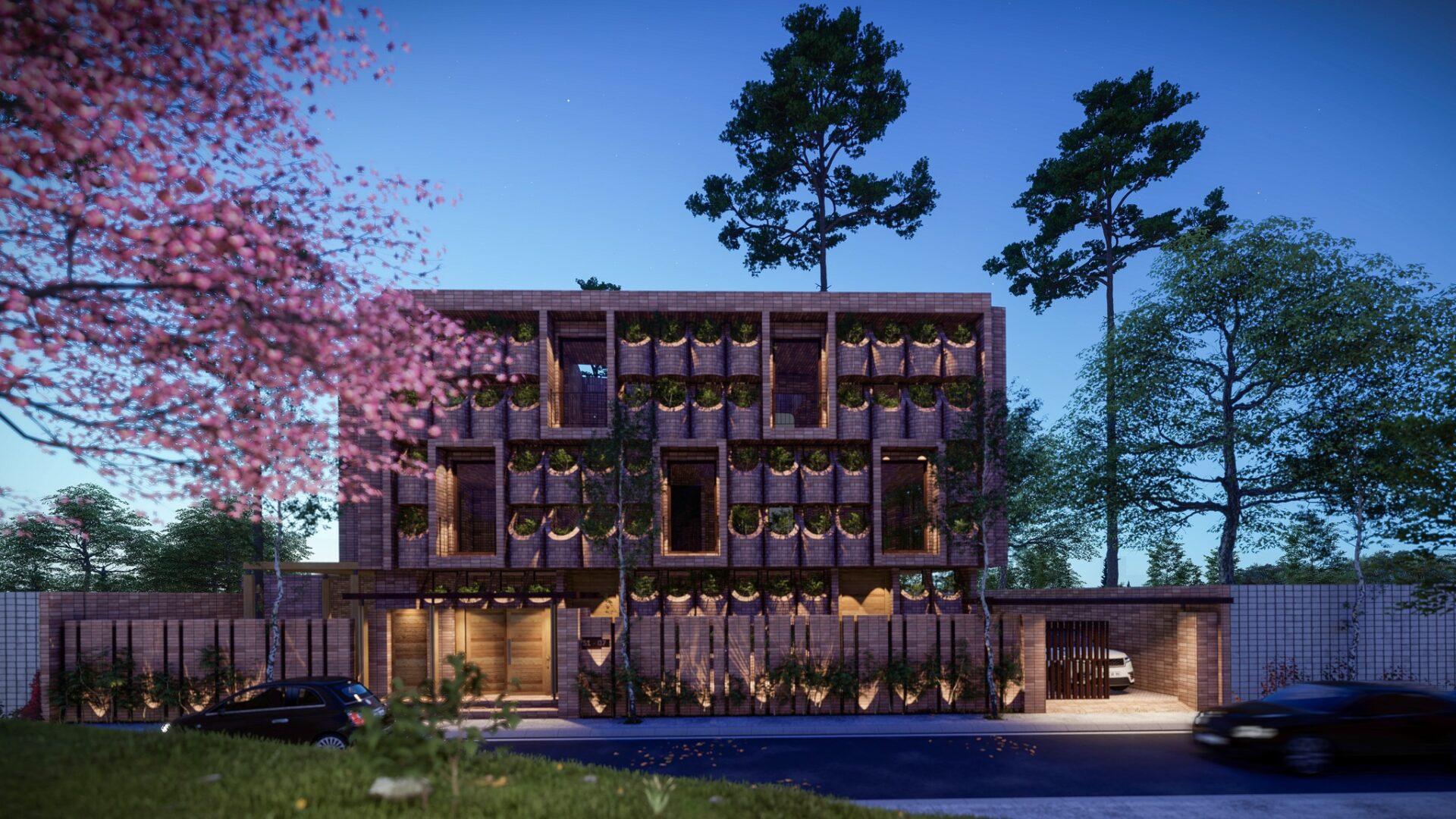 Mặt đứng với nhiều mảng xanh hòa quyện với vẻ đẹp của vật liệu gạch trong công trình tạo nên một hình khối kiến trúc thân thiện với môi trường.