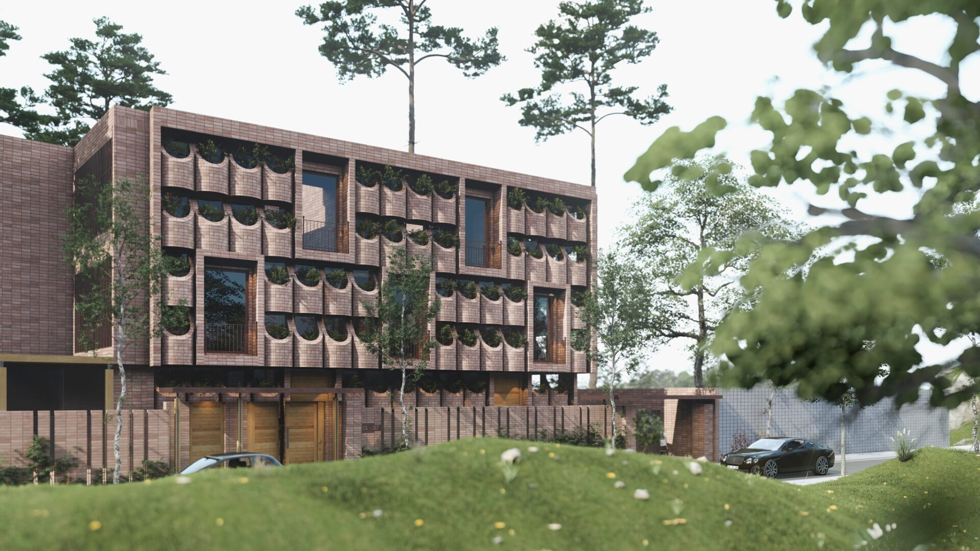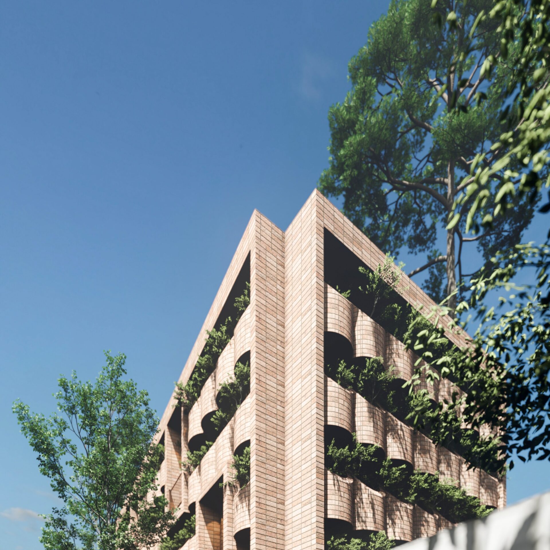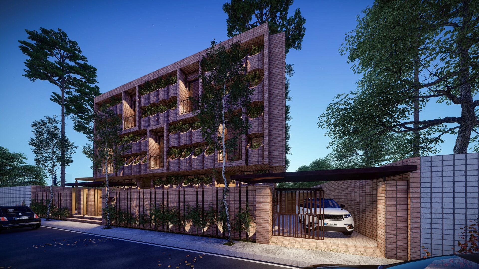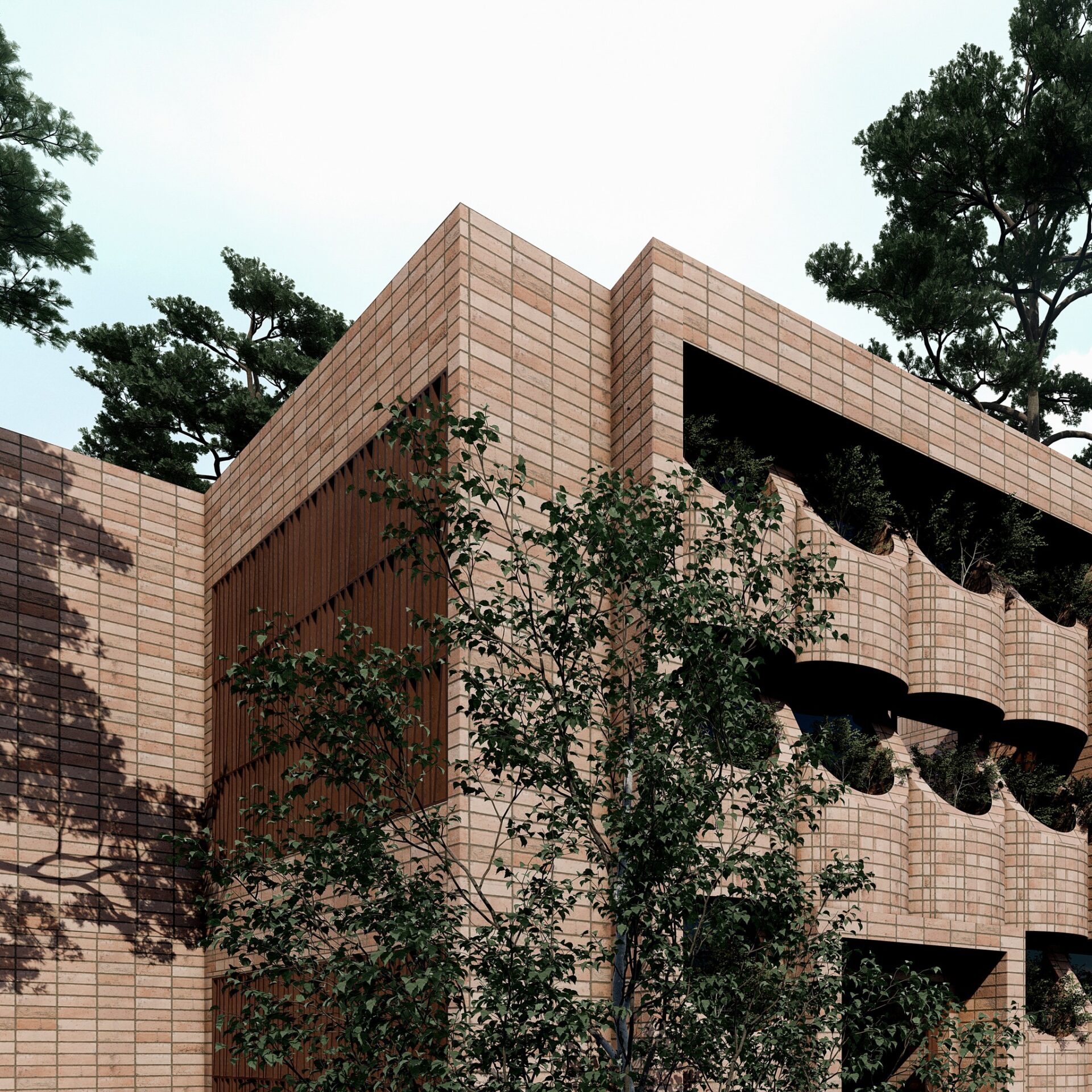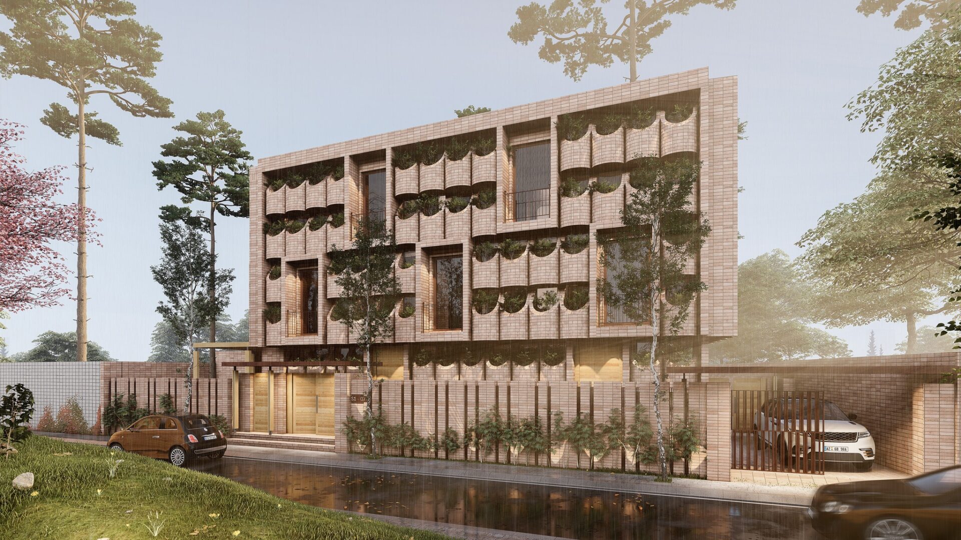 Mặt đứng với nhiều mảng xanh hòa quyện với vẻ đẹp của vật liệu gạch trong công trình tạo nên một hình khối kiến trúc thân thiện với môi trường.