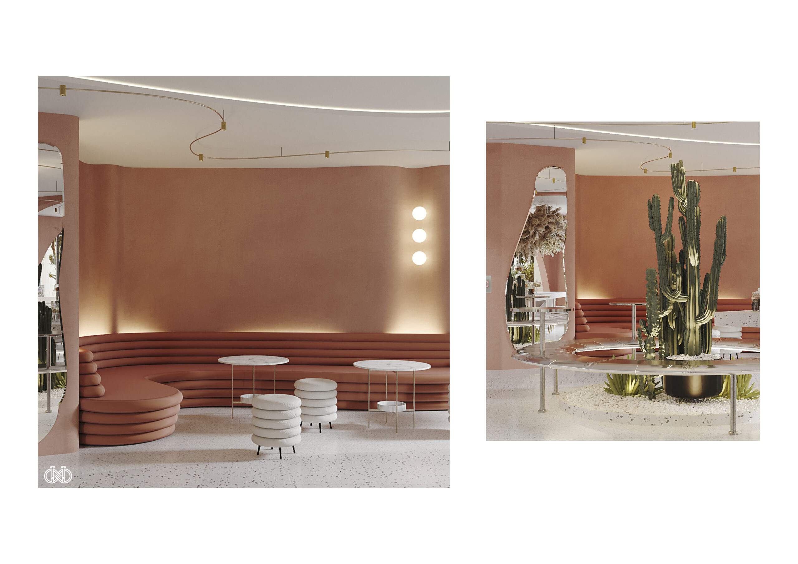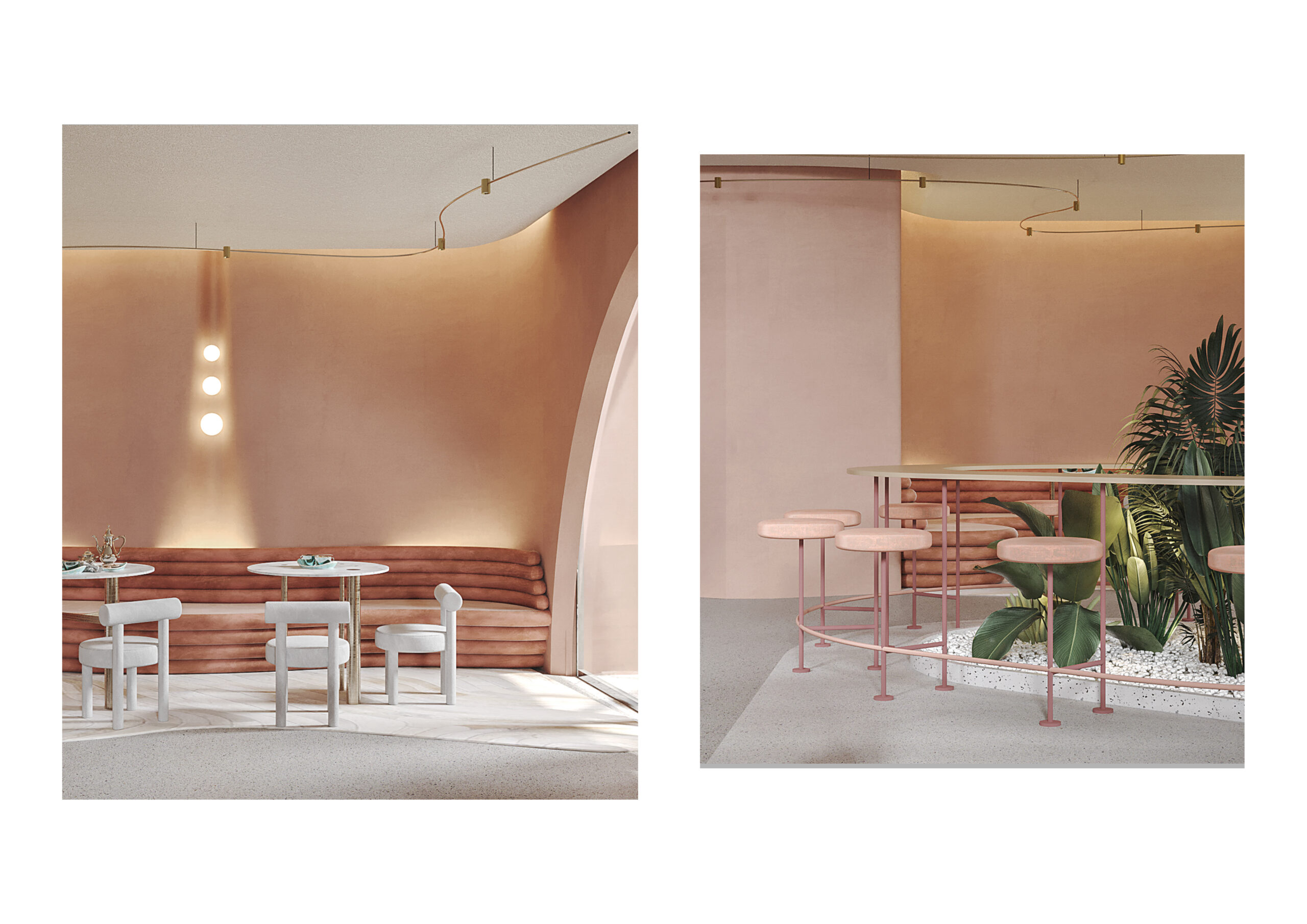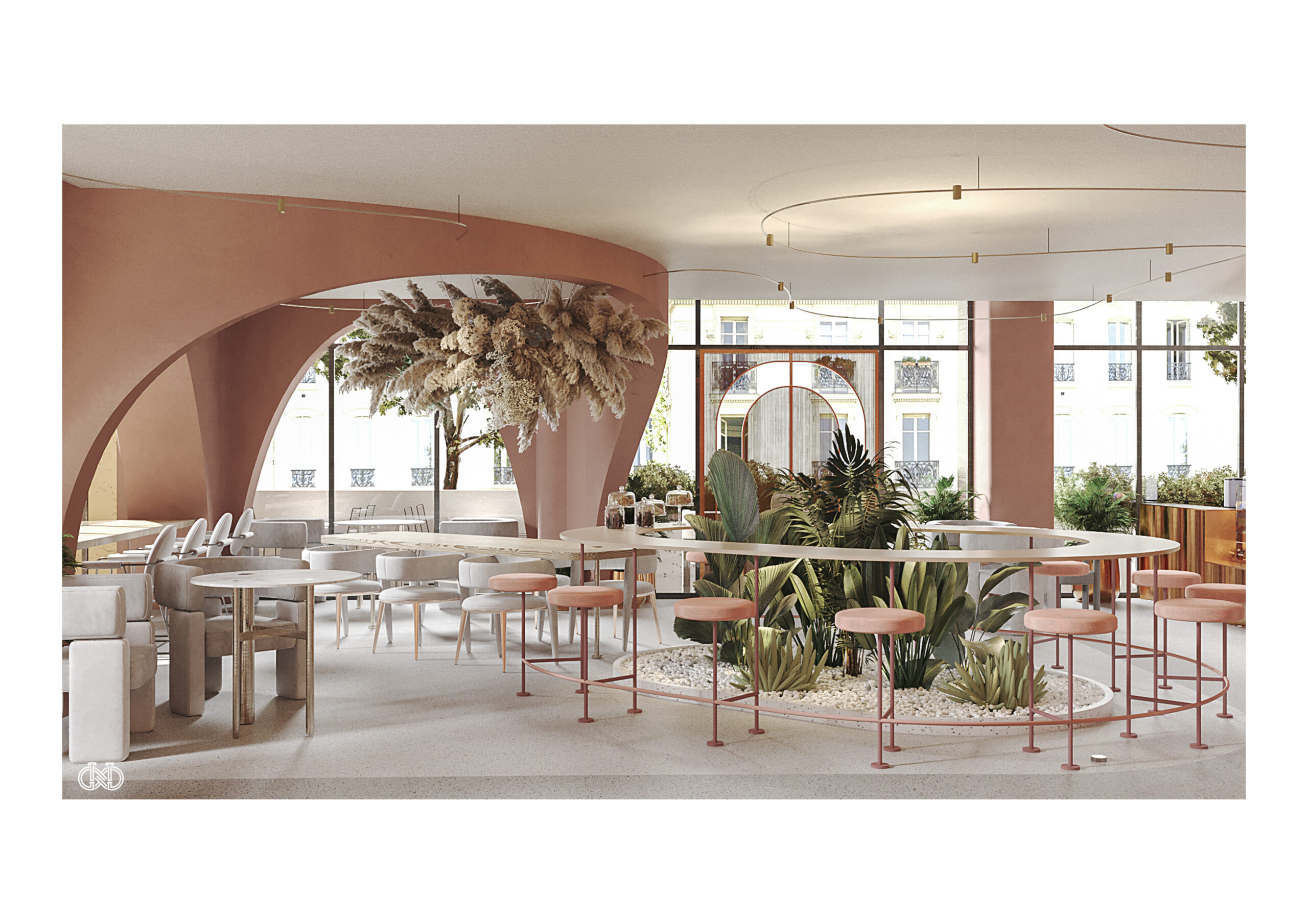 Về thiết kế nội thất, chúng tôi ưu tiên những đường nét bo tròn, uốn lượn mềm mại, không tạo cảm giác góc cạnh từ bàn ghế đến quầy bar. Ngay cả trần nhà và các bức tường cũng được thiết kế với những đường cong tinh tế. Không gian bên trong còn được trang trí thêm những chậu cây xanh, giúp nơi trú ẩn này thêm phần an yên và tươi mát giữa lòng thành phố xô bồ, căng thẳng.